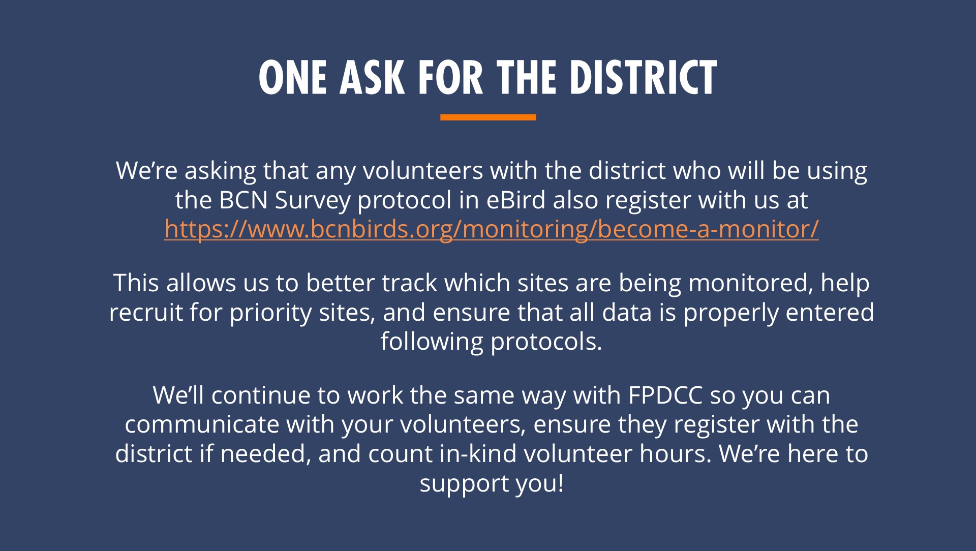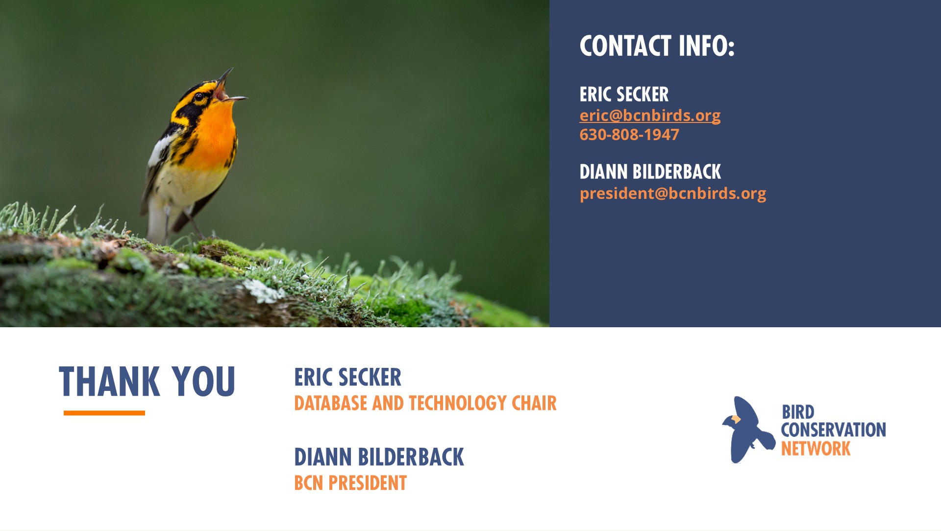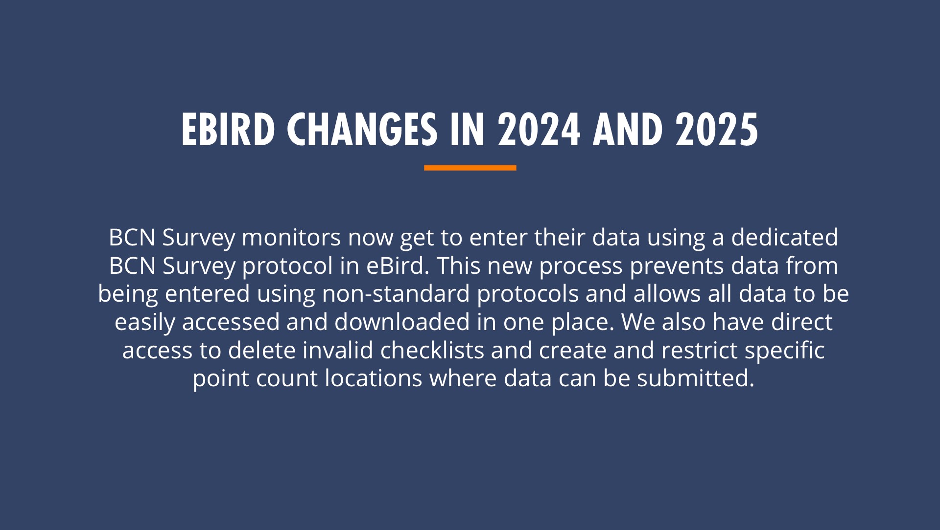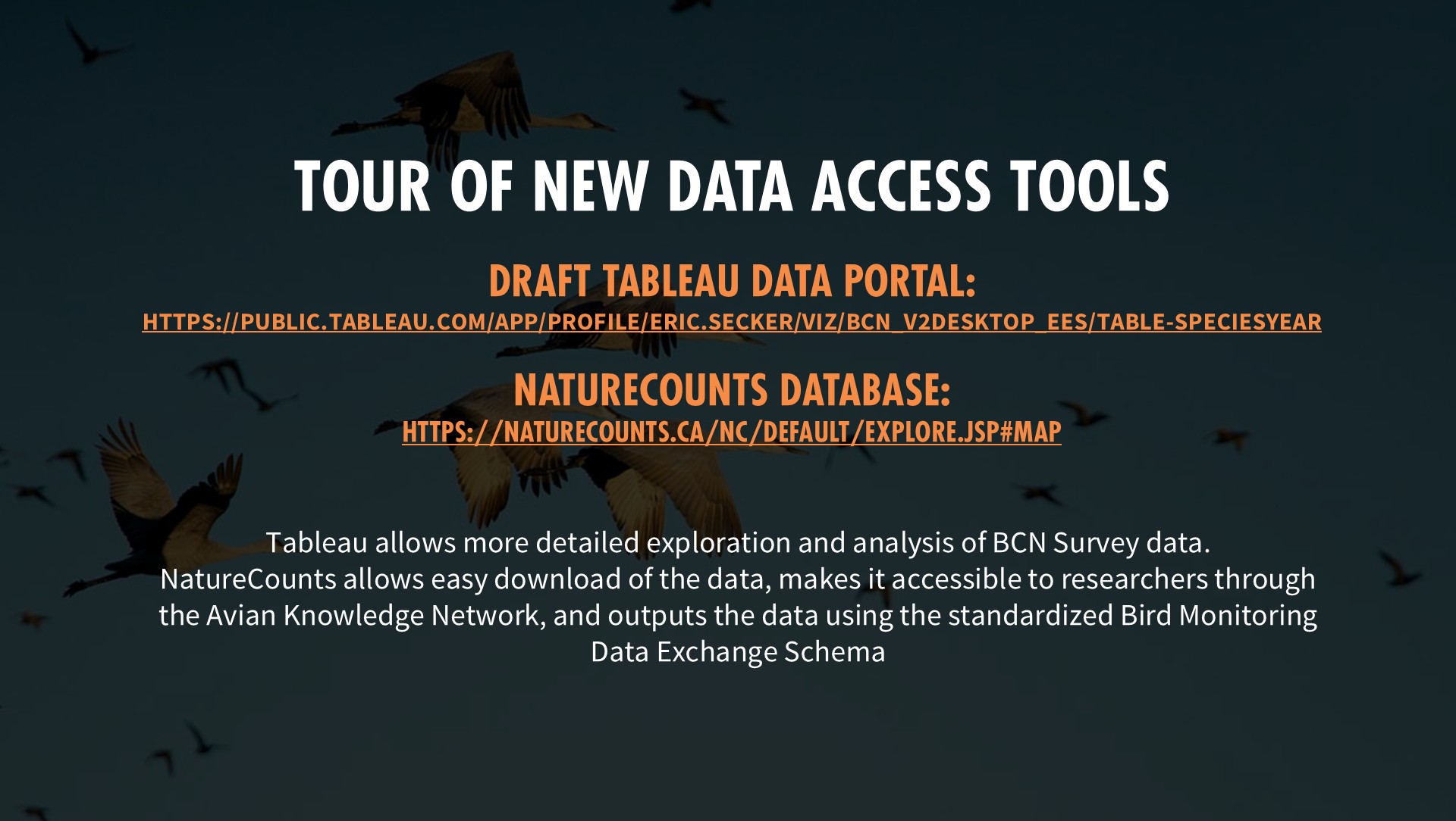 FPDCC Presentation – April 2026 April 8, 2026 DRAFT TABLEAU DATA PORTAL: https://public.tableau.com/app/profile/eric.secker/viz/BCN_V2desktop_EES/Table-SpeciesYear NATURECOUNTS DATABASE: https://naturecounts.ca/nc/default/explore.jsp#map